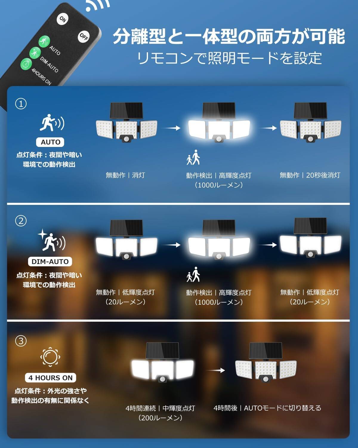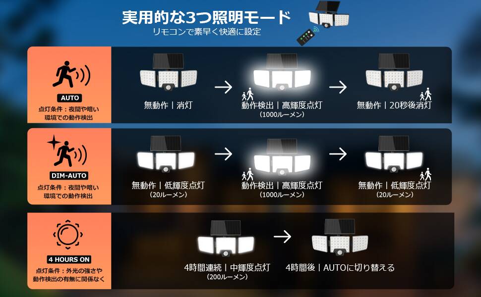 ●DIM-オートモード:夜間に低輝度で常点灯し、動きを検知したら、1000ルーメンの高輝度で点灯します。人が離れたら低輝度で常点灯に戻ります。