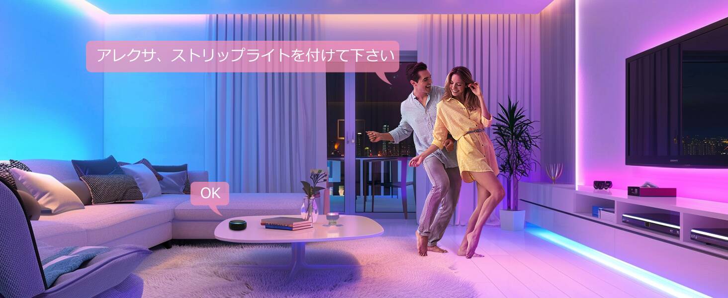 Amazon Alexa、Google Homeと接続することにより、音声コントロールも可能となります。手が離せない時でも、簡単な音声コマンドで、希望の色、明るさ、照明効果を自由に指定することができますので、より便利でスマートなライフスタイルを実現します。
