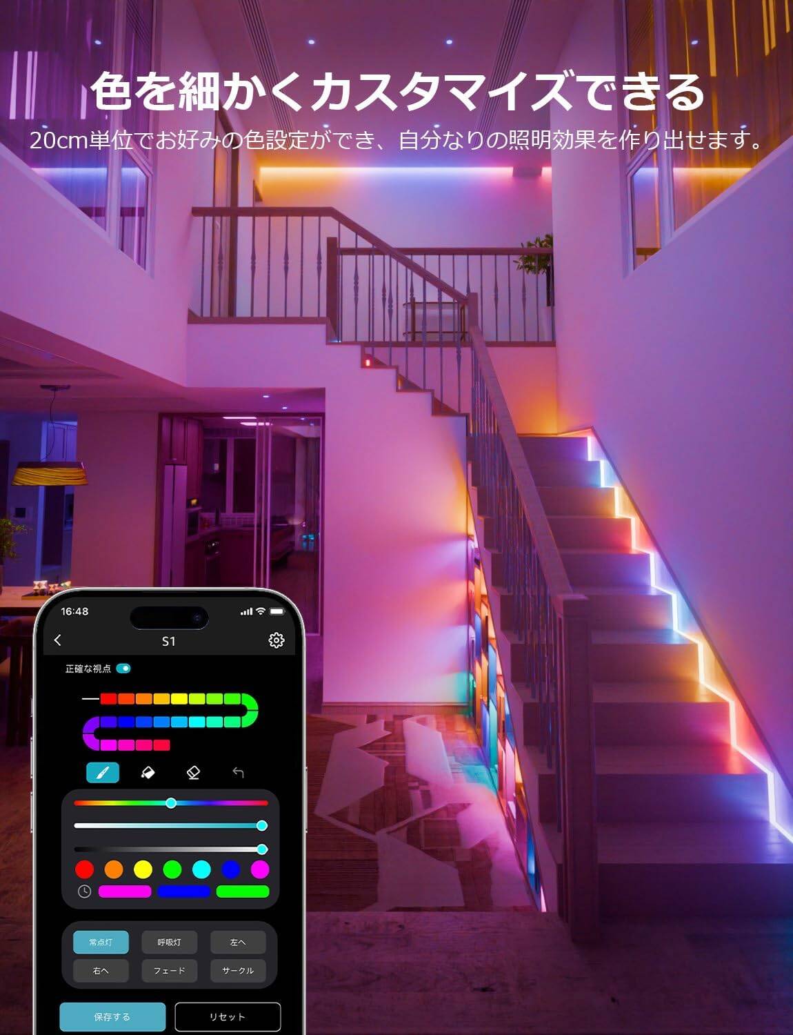 - 【自由度が高いDIY体験】①LightGPMに生成された照明効果に基づいてDIYします:AIによって生成された照明効果の色、明るさ、スピードなどを更に編集することができ、自分なりの効果をカスタマイズできます。②ゼロから完全DIYします:Lepro AIスマートledテープライトは20cm単位で色をカスタマイズでき、数cm単位で好みの色設定ができます。自分で明度・色相・彩度を設定して細かくプログラムを作ることもできます。