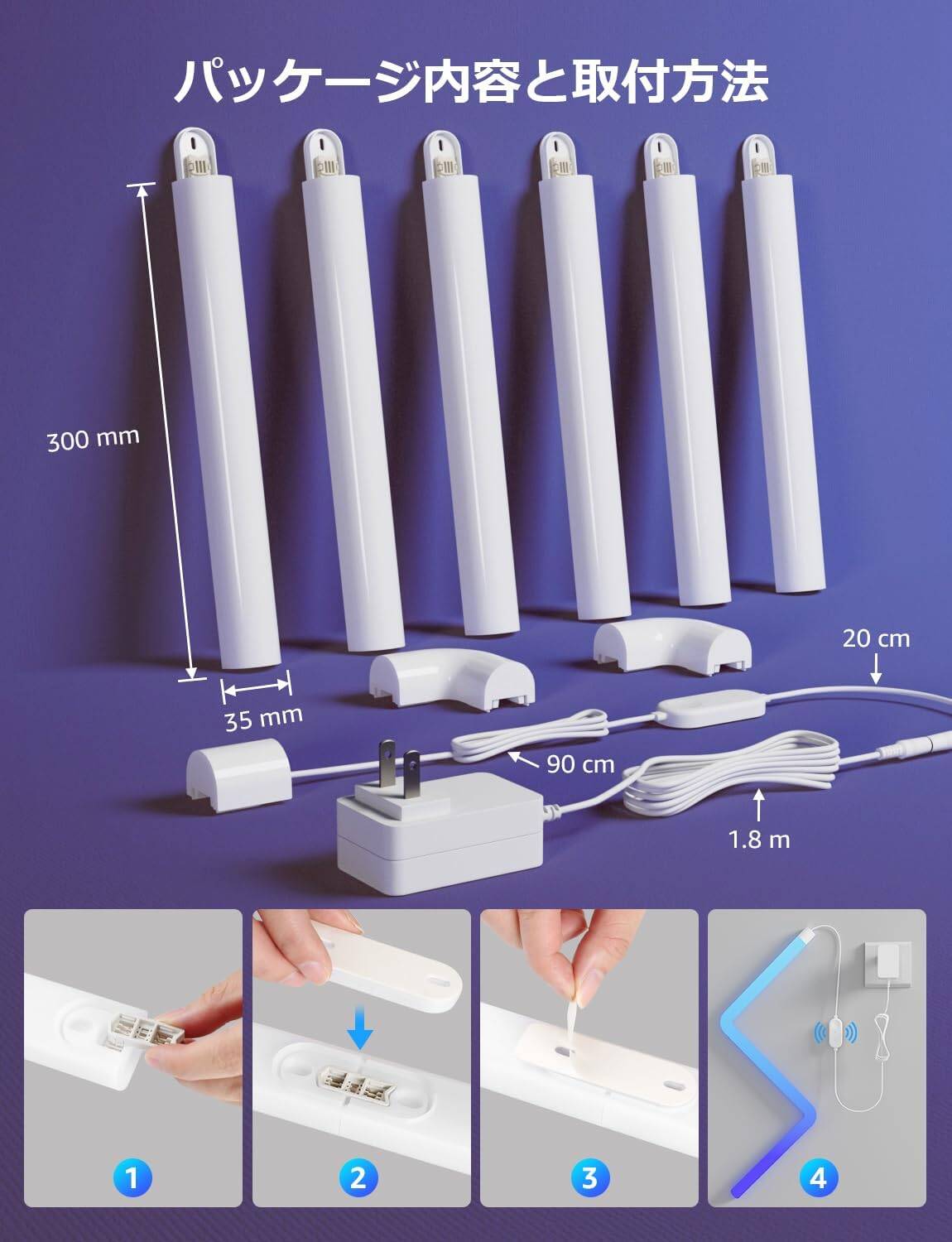 - 【取付簡単&2年間保証】付属の接続コネクタで各バーライトを接続して、壁に貼って完成。パッケージ内容:30cmバーライト6本、L字型コネクタ2個、接続コントローラー、12V3A電源アダプター、日本語取扱説明書。日本PSE認証済みですので、ご安心なさってお使い下さい。