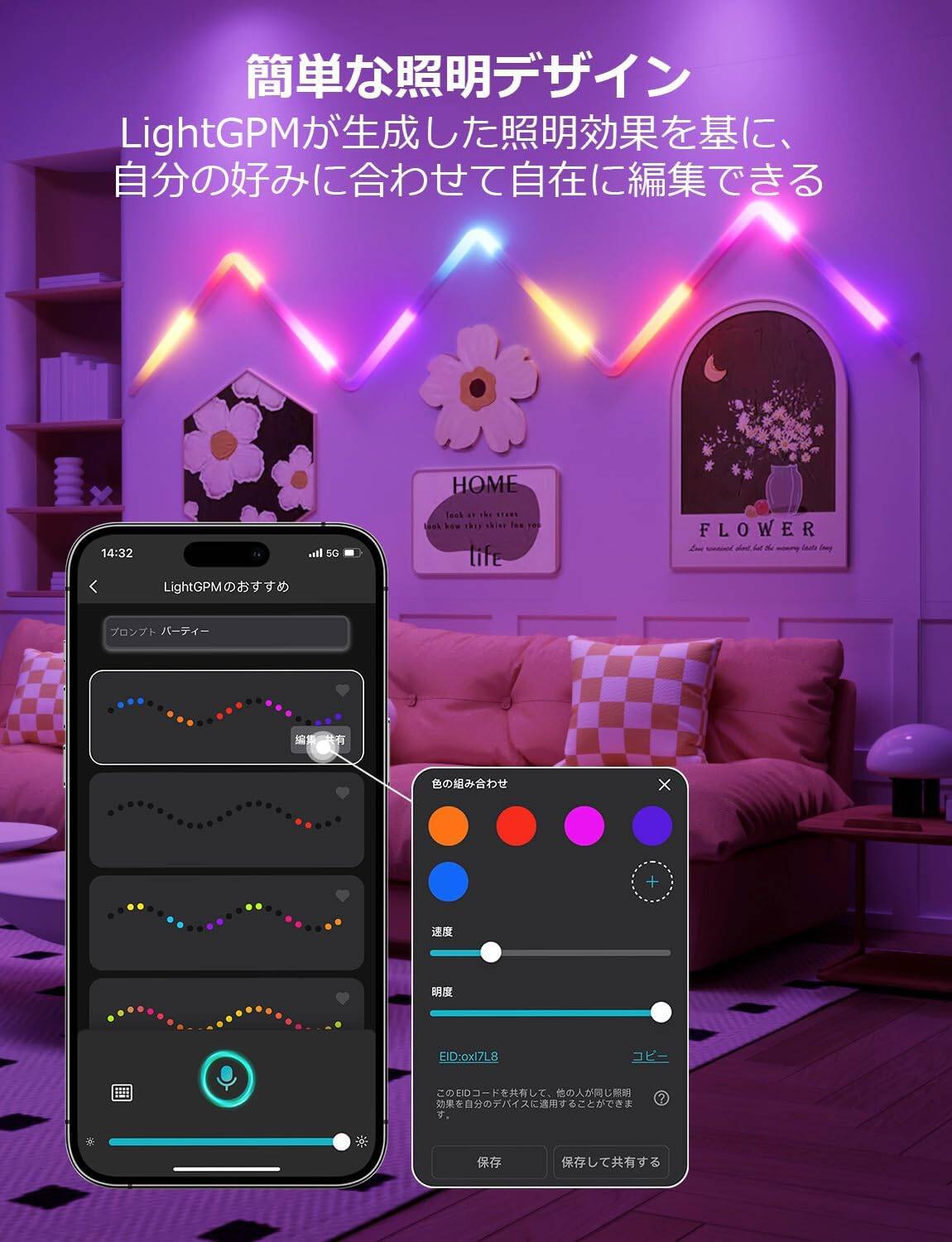 - 【簡単な照明デザイン&共有機能】LightGPMが生成した照明効果を基に、自分の好みに合わせてライトの色、明るさ、速度などを自在に編集できます。作成した照明効果はEIDと表し、EID を共有することで、他のユーザーが自分のデバイスで同じ照明効果を再現できるようになります。