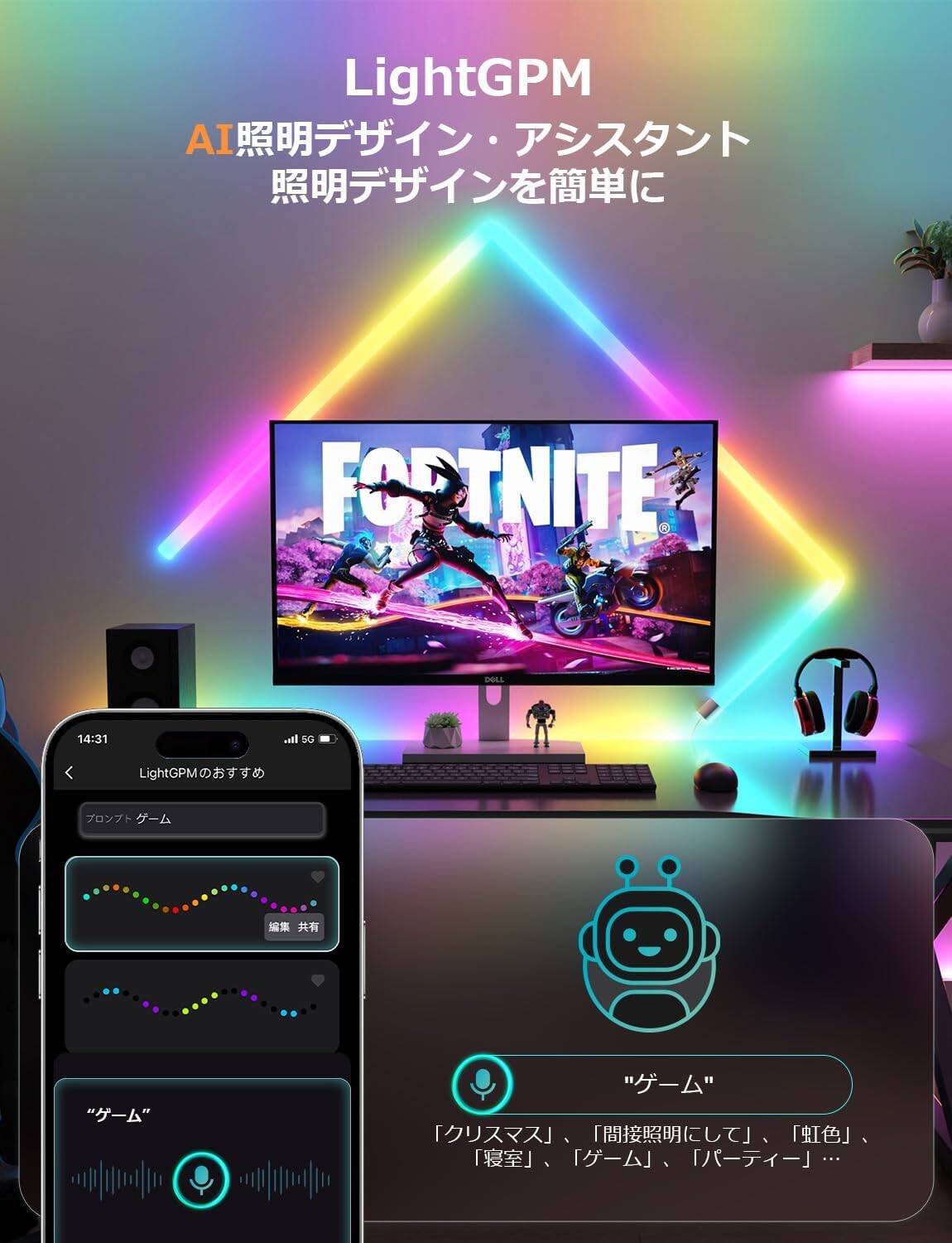 - 【使い方が簡単・内蔵の音声認識によるAI生成光】:Lepro AIに話しかけて、AIは何千兆もの照明効果と色の組み合わせから最適な照明効果をすすめます。例えば「間接照明にして」、「虹色」、「オーロラ」、「化粧」、「寝室」、「ゲーム」、「クリスマス」などと話して、Lepro AIはシーンにぴったりな点灯効果を生成します。光色が流動できるとの特徴で、テレビ、ゲームルームやコンピューターモニター周辺の壁のデコレーションとして最適です。ホームアイデア次第でいろんな演出ができます。